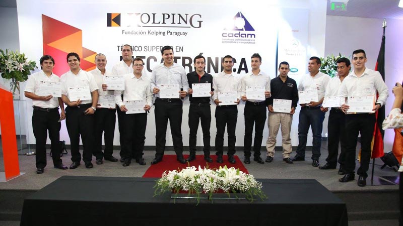 El sistema dual de enseñanza es emprendido por la Fundación Kolping a través del Instituto Técnico Superior Kolping y el pasado 14 de abril se realizó la ceremonia de entrega de diplomas a los egresados de este importante curso, el primero de su clase llevado a cabo en alianza con la CADAM, con la presencia del Ministro de Trabajo, Empleo y Seguridad Social, Dr. Guillermo Sosa, el Vice-Ministro de Educación Superior del MEC, Dr. Gerardo Gomez; el Director de Institutos Técnicos Superiores del MEC, Lic. Atilio Dentice; El Presidente de la Fundación Kolping Paraguay (FUKOLPA) Dr. Walter Bastos, el Director General del SNPP, Lic. Ramón Maciel Rojas, la Secretaria Ejecutiva de Sinafocal, Lic. María Victoria Diesel de Coscia, el Director Ejecutivo de Kolping Paraguay, Olaf Von Brandenstein, el Vicepresidente de la CADAM, Víctor Servín, además de otras autoridades nacionales, empresarios e industriales.